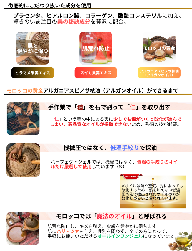 アルガニアスピノサ核油とアルガンオイル成分によるもの機械圧で採油されたオイルではなく、低温手絞りで採油された良質なオイルを使用しています。